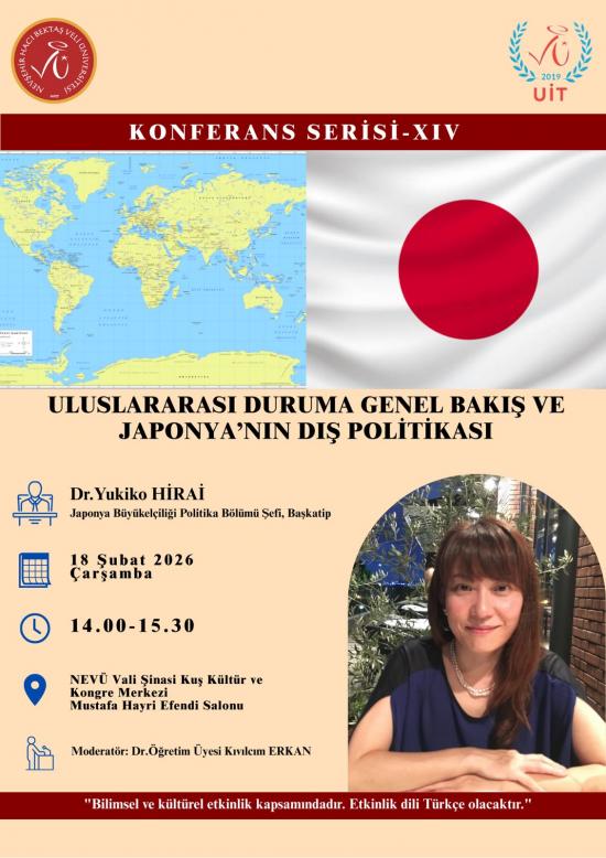 Nevşehir Hacı Bektaş Veli Üniversitesi (NEVÜ), "Konferans Serisi-XIV" kapsamında uluslararası diplomasi dünyasından çok değerli bir ismi ağırlıyor. Japonya Büyükelçiliği Politika Bölümü Şefi ve Başkatip Dr. Yukiko Hirai, üniversitemiz öğrencileri ve akademik kadrosuyla Japonya dış politikasını değerlendirmek üzere bir araya gelecek. Tüm öğrencilerimiz ve akademik personelimiz davetlidir.